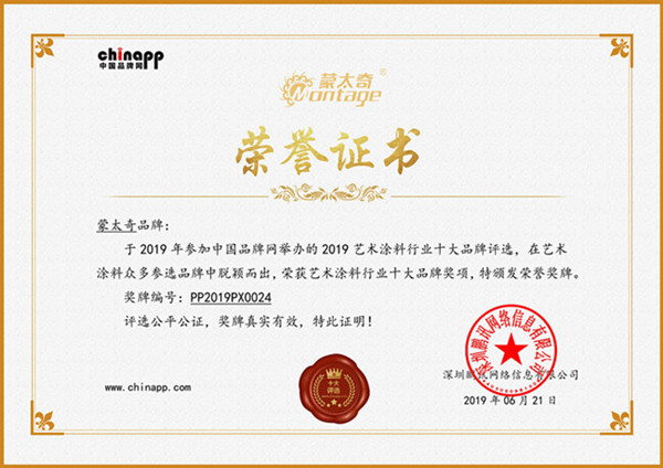 序:蒙太奇品牌于2019年參加中國(guó)品牌網(wǎng)舉辦的2019藝術(shù)涂料行業(yè)十大品牌評(píng)選,在藝術(shù)涂料眾多參選品牌中脫穎而出,榮獲藝術(shù)涂料行業(yè)十大品牌獎(jiǎng)項(xiàng)。